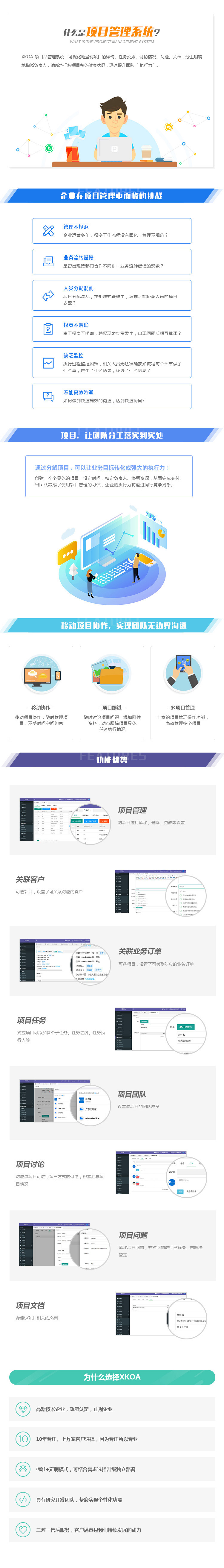 XKOA-项目品管理系统,可视化地呈现项目的详情、任务安排、讨论情况、问题、文档,分工明确地指派负责人,清晰地把控项目整体健康状况,迅速提升团队“ 执行力”。